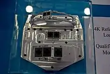 The HFI was sensitive between 100 and 857 GHz, using 52 bolometric detectors, manufactured by JPL/Caltech,[6] optically coupled to the telescope through cold optics, manufactured by Cardiff University's School of Physics and Astronomy,[7] consisting of a triple horn configuration and optical filters, a similar concept to that used in the Archeops balloon-borne experiment. These detection assemblies are divided into 6 frequency bands (centred at 100, 143, 217, 353, 545 and 857 GHz), each with a bandwidth of 33%. Of these six bands, only the lower four have the capability to measure the polarisation of incoming radiation; the two higher bands do not.[2]