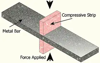 The testing essentially consists of a thin metal bar being compressed by two equally wide compressive strips, which are located of opposite sides of the thin bar. Then, over a range of increasing loads on the bar, the compressive forces lead to the thickness of the metal bar being reduced. This change of thickness is then measured sequentially after each loading, and after some mathematics a stress-strain curve can be plotted.