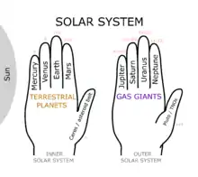 A planetary mnemonic refers to a phrase created to remember the planets and dwarf planets of the Solar System, with the order of words corresponding to increasing sidereal periods of the bodies. One simple visual mnemonic is to hold out both hands side-by-side with thumbs in the same direction (typically left-hand facing palm down, and right-hand palm up). The fingers of hand with palm down represent the terrestrial planets where the left pinkie represents Mercury and its thumb represents the asteroid belt, including Ceres. The other hand represents the gas giants, with its thumb representing Trans Neptunian objects, including Pluto.