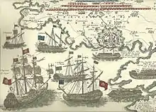A surprise British raid on Le Havre in early July did considerable damage, destroying a number of the transports.[19] However, the success of the venture lured the British commanders into a false sense of security, making them believe it had been a greater setback than it had in fact.[20] The French intended to capitalise on this, but scaled back their initial plans. A War Council in Paris decided to launch the expedition to Scotland first, and if it was successful, send follow-up forces to Portsmouth and Maldon, Essex. Exact details were left vague to enable them to respond to changing circumstances. Delays to the assembly of the invasion force pushed back the date of the launch, and the sea grew rougher and more dangerous to cross. Some French leaders were wary of putting the fleet to sea in potentially bad weather, but the need for a major victory to restore French morale and win an honourable peace overruled their concerns.[21] In October, D'Aiguillon arrived at his command centre at Vannes, near to where much of his army had gathered. For five days after 15 October, the British blockading squadrons were forced to withdraw from the French coast by a storm, leaving the French invasion forces free to sail. Conflans declined to leave harbour, as he believed his fleet was not ready, and on 20 October the British returned to blockade the French Atlantic ports again.[22]