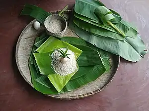 In Meitei mythology and Meitei folklore of Kangleipak (Meitei for 'Manipur'), Pān (Meitei for 'Colocasia' / 'Taro') plants are mentioned. In the Meitei folktale of the Hanuba Hanubi Paan Thaaba (Meitei for 'Old Man and Old Woman planting Colocasia' / 'Taro'),[15][16][17] an old aged lonely couple, who have no youths in their family, were deceived by some trickster monkeys, regarding the planting of the Colocasia/Taro plants in a very different unusual style of plantation.[18][19][20] The old couple agreed to do the monkeys' advices, peeling off the best tubers of the plants, then boiling them in a pot until softened and after cooling them off, wrapping them in banana leaves and putting them inside the soils of the grounds.[21][22] In the middle of the night, the monkeys secretly came into the farm and ate all the well cooked plants. After their eating, they (monkeys) planted some inedible giant wild plants in the place where the old couple had placed the cooked plant tubers. In the morning, the old couple were amazed to see the plants getting fully grown up just after one day of planting the tubers. They were unaware of the tricks of the monkeys. So, the old couple cooked and ate the inedible wild Taro plants. As a reaction of eating the wild plants, they suffered from the unbearable tingling sensation in their throats.[23][24][25]