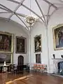 At the end of the 19th century the 5th Marquess inherited the family seat, which he renamed Anglesey Castle. Renowned for his lavish spending and flamboyant lifestyle, he converted the family chapel inside the house into a performance space called the Gaiety Theatre. Plays were put on regularly, with "the Dancing Marquess" often taking the lead role himself.[6] The 5th Marquess's extravagant spending drained the family fortune, and after his death in 1905, 6th Marquess began to sell off assets to help restore the solvency of the family. The family also sold off their main home at Beaudesert and their London house, and moved into Plas Newydd permanently.[7] The 6th Marquess made the final big changes to the house by removing the crenellations from the roof, disposing of the theatre, knocking three servants' rooms together to make the dining room and covering over a courtyard to provide a roof for the servants. In the 1930s the artist Rex Whistler was a regular visitor to Plas Newydd. He painted numerous portraits of Lady Caroline Paget, and in 1936-38 painted the largest canvas painting in the UK.[8] It is a trompe-l'œil seascape painting that fills a whole wall of the dining room with an imagined scene of Italianate churches, castles, Snowdonian mountains and a complete harbour wall, with tricks of perspective that mean the scenes appear to change when seen from different parts of the room.[9]