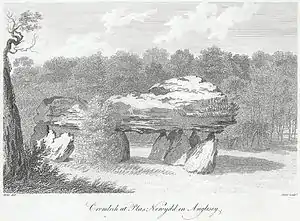 Bryn-yr-Hen-Bobl Burial Chamber ("Hill of the old people") is a substantial mound with a stone chamber, to the south of the parkland. Bones were found here in 1754. It was excavated by W J Hemp in 1929–35, and Neolithic pottery appeared to lie under and in front of the mound, suggesting a settlement predating its use as a burial site. The chamber was given a doorway following the dig, but is not accessible to the public. It is visible from the southern edge of 'Garden Wood'.[17]
