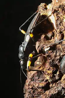 Platymeris biguttatus or two-spotted assassin bug is a venomous predatory true bug of west and southwest African origin ranging in size from 10–40 mm.[1] As a true bug of the order hemiptera, it has needle like mouth parts designed for sucking juices out of plants or other insects instead of chewing. P. biguttatus has sharp stylets in its proboscis or rostrum used to pierce the exoskeleton of its prey. Saliva is then injected into the prey which liquifies its tissues, and the rostrum is then used to suck out the digested fluids. If disturbed, it is capable of a defensive bite considered to be more painful than a bee sting.[2] It is also known to spit venom that can cause temporary blindness in humans.