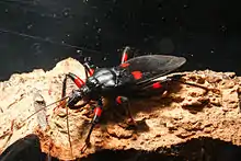 Platymeris laevicollis is a venomous predatory true bug from central Africa that can be found in forests, scrublands, grasslands, and croplands. They are efficient predators and are used by farmers on coconut plantations to control herbivorous pests such as the rhinoceros beetle.[1] As a true bug of the order Hemiptera, it has needle-like mouth parts designed for sucking juices out of plants or other insects instead of chewing. P. laevicollis has sharp stylets in its proboscis or rostrum used to pierce the exoskeleton of its prey. Saliva is then injected into the prey which liquifies its tissues, and the rostrum is then used to suck out the digested fluids. If disturbed, it is capable of a defensive bite considered to be more painful than a bee sting.[2]