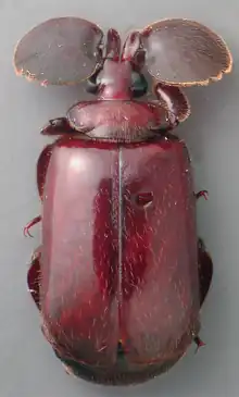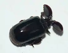 The species was first described by J. O. Westwood as Platyrhopalus melleii, named after entomological collector André Melly of Manchester who had obtained a specimen from Malabar. Westwood however spelled the collector's name incorrectly as "Melley" and the species name has since been variously rendered in literature as meleii, mellyi or melleyi.[1] Adults live inside the nests of ants of the genus Carebara and are rarely seen except when attracted to lights at night. The flat terminal segment of the antenna is thought, based on studies of pupal development, to be formed by the fusion of multiple antennomere segments.[2][3]