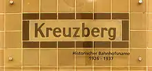 The station opened on 14 February 1926 and was then called Kreuzberg (after the hill which gives the district its name; it is on the edge of the district).[5] Two old wall signs with that name, uncovered in renovation, have been preserved under glass. It was the terminus of Line CII (today U6) until the opening of Paradestraße station on 10 September 1927. The latter was originally called Flughafen (Airport). However, in 1937 that station received its current name and the Kreuzberg station was renamed Flughafen.[1] It had a direct connection to Tempelhof Airport, at that time unique in the world;[6] it remained the connection between the airport and the city's public transport system until the airport closed in October 2008.