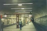 The station was designed by Alfred Grenander. For topographic reasons, it lies unusually deep underground and the station was therefore constructed with an unusually high vault and long platform.[1] Grenander made exceptionally expressive use of the play of light and shadow in the vaulting and its supports.[2] It is one of only 2 Berlin U-Bahn stations with no central columns, the other being Märkisches Museum.[3] It is tiled in grey with black accents.[1]