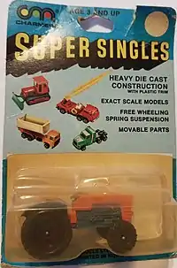 On another Playart series, the name was printed with each letter a separate color, on bright packages marketed as FASTWHEEL (see photo). The phrase "really fast - die cast" was also printed on these blister-paks and boxes with the checkered black and white background. Playart diecast cars were also packaged as Charmerz for New York distributor Charles Merzbach.[1] These were marketed as Charmerz Super Singles and packaged in a blue blister card with many different vehicles listed on the back. The Playart name, however, did not accompany all toy packaging. Vehicle offerings were more clever than those of other Hong Kong and Chinese makers of the 1970s and 1980s. Marques such as a 1967 Eldorado, a Fiat X 1/9, a Rolls-Royce Corniche coupe, and a Lotus Elite were not necessarily unique in the diecast world, but taken as a whole the series was creative and model selections unique. Despite tooling origins, however, one gets the feeling that the makers of Playart cars were auto enthusiasts perhaps more than other toy manufacturers. For example, the Playart Plymouth Barracuda (a former Hot Wheels casting) is realistically labeled a Barracuda Formula S on its base, showing a more refined automotive knowledge by the model creators. On the other hand, however, the 1969 Mustang Coupe only says "Mustang" on its base.