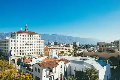 Playhouse Village, (formerly known as Playhouse District) a neighborhood in Pasadena, California, is bordered by Interstate 210 to the north, California Boulevard to the south, Los Robles Avenue to the west, and Hudson Avenue to the east, with a panhandle-like extension to Wilson Avenue. The district is also notable for its manhattanization, the legacy of extensive urbanization from the 1960s to the 1980s.