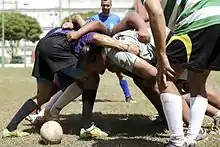 A ruck is formed when at least one player from each side bind onto each other with the ball on the ground between them.[25] A ruck often ensues following a tackle.[26] This physical contact, or binding, is generally by locking shoulders while facing each other. Additional players may join the ruck, but must do so from behind the rearmost foot of the hindmost teammate in the ruck;[27] this is often referred to as "coming through the gate".[28] If players do not go "through the gate", it is a penalty to the opposition. Any player not taking part in the ruck and maul must retreat behind the offside line, a notional line that runs parallel to the goal-lines through the rearmost foot of their hindmost teammate in the ruck or maul.[29]