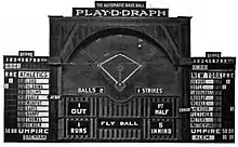 The Playograph was a machine or an electric scoreboard used to transmit the details of a baseball game in the era before television. It is approximated by the "gamecast" feature on some sports web sites: it had a reproduction of a baseball diamond, with an inning-by-inning scoreboard, each team's lineup, and it simulated each pitch: a ball, a strike, a hit, an out, and so on.