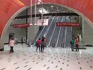 Plaza Egaña is a transfer station between the Line 3 and Line 4 of the Santiago Metro. It is located under Egaña Square. The Line 4 station was opened on 30 November 2005 as part of the inaugural section of the line between Tobalaba and Grecia. The Line 3 station was opened on 22 January 2019 as part of the inaugural section of the line, from Los Libertadores to Fernando Castillo Velasco.[4]