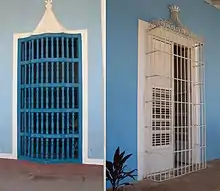 The large main door typically has a smaller entrance door (or doors) cut into it. In contrast to the houses of the same period in Havana the door tends to open directly onto a living area, rather than having a vestibule or entrance hall. The doors are often surrounded by architectural plaster mouldings. Windows lack glass, instead they are open to the elements, but have barrotes, bars constructed of small turned wooden columns which allow the air to circulate without allowing entrance to the house. In the 19th century these wooden barriers were replaced by wooden shutters behind a wrought-iron grille.[2]