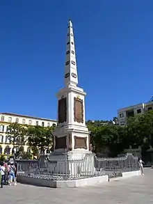 Monumento a Torrijos (Monument to Torrijos) is a 19th-century monument located in the center of the plaza. Spanish architect Rafael Mitjana designed the monument in honor of General José María Torrijos and 48 of his companions who were shot to death on order of Ferdinand VII . The base of the monument houses the remains of the men.[4][5]