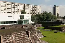 The square contains the archaeological site of the city-state of Tlatelolco and is flanked by the oldest European school of higher learning in the Americas called the College of Santa Cruz de Tlatelolco[3] (built in 1536 by friar Juan de Torquemada[4][5]) and by a massive housing complex built in 1964.