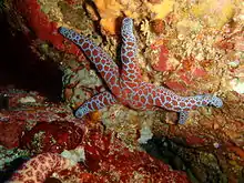 This five-armed starfish is distinguished by its very bright colors. A group of raised yellow ridges covers its red upper surface and it is soft in texture. Plectaster decanus is one of the few poisonous sea stars, and can cause numbness in humans if it is carried for any length of time.[2]