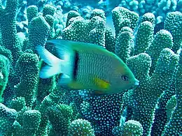 Plectroglyphidodon dickii, common name blackbar devil, Dick's damsel or narrowbar damselfish, is a species of damselfish in the family Pomacentridae.[2] This species was formerly classified as Dascyllus aruanus, but recently the populations of western Indian Ocean and Pacific Ocean have been split off.[3]