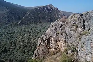 The Pleistos valley is not much of a rift valley. The rift is relatively recent, the separation is slight, and a scarp is still visible all the way from Amphissa to the head of the valley.[11] It is not unmitigated, however. There are few places where the climber might have to ascend a thousand-foot cliff. Most of the scarp has been subject to extensive rockfalls and landslides, which have created a slope of scree up to about 50% of the scarp. The scree extends over the entire valley floor up to the Pleistos ravine. Slopes vary from very slight to up to 60°. The bare scarp varies from 60° to 90° and beyond, if there is an overhang. In general, the scree is on the footwall of the fault, but erosion has produced some overhangs.
