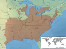 The American five-lined skink is a ground-dwelling animal. It prefers moist, hardwood areas with a permanent water source such as rivers or streams, as well as sites to bask in the sun.[11] It can also be found in broken, rocky areas at the northern edge of its habitat. While little is known about any hibernation patterns, Plestiodon fasciatus is rarely seen throughout winter and the surrounding months. It is assumed by scientists that they are sheltered and dormant under rocks, logs, or leaves provided by the hardwood areas it inhabits.[12] Resistant to minor disturbances, but can be affected by the removal of debris.[13]