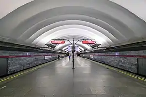 Ploshchad Muzhestva (Russian: Пло́щадь Му́жества, Square of Fortitude) is a station of the Saint Petersburg Metro. Opened on 31 December 1975. The station got its name because of its location next to the eponymous square (roundabout). The square and the station were designed as a starting point on the way to Piskaryovskoye Memorial Cemetery where hundreds of thousands of victims, mostly civilian, of the 1941-44 siege of the city during World War II are buried.
