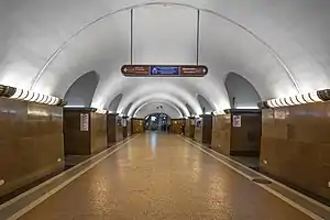 Ploshchad Lenina is a deep underground pylon station at 67 metres (220 ft) depth. The underground hall was designed by architect A.K. Andreev.