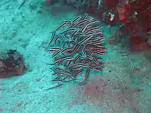 Juveniles of Plotosus species often form dense aggregations; in P. lineatus juveniles form dense ball-shaped schools of about 100 fish, while adults are solitary or occur in smaller groups of around 20 and are known to hide under ledges during the day.[3][4][5]