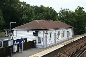 The station features staggered platforms, whereby the 'up' (London-bound) platform is mostly west of the eastbound platform (on which the station buildings are situated). A footbridge links the platforms.[1]