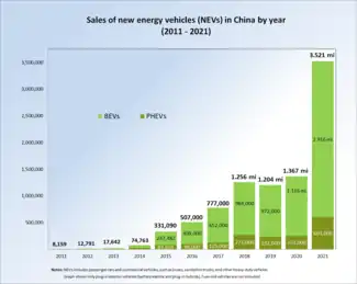 New energy vehicles sales in totaled 3.521 million in 2021, consisting of 3.334 million passenger cars and 186,000 commercial vehicles.[11] As of December 2021, the stock of highway legal plug-in cars totaled 7.84 million units, corresponding to about 46% of the global plug-in car fleet in use. Of these, all-electric cars accounted for 81.6% of the all new energy passenger cars in circulation.[135] Plug-in passenger cars represent 2.6% of all cars on Chinese roads at the end of 2021.[135]