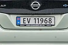 In July 2016, the first electric vehicles registered with the new "EK" series were on the road.[51][68] About 90,000 pure electric vehicles have been registered by the end of August 2016, depleting the "EL" prefix plates.[69] Just over two years later, in July 2018, the "EK" series was depleted, and the prefix "EV" plates were deployed.[54][70] The first vehicles with the "EB" prefix series were registered in September 2019. The prefix "EB" stands for "elektrisk bil", Norwegian for electric car. The next special series will be "EC" with no particular meaning.[54]
