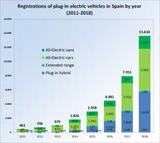 As of October 2022, there were 200,000 electric vehicles in Spain.[1] As of September 2022, 6.8% of new cars registered in Spain were battery electric, and 7.4% were plug-in hybrid.[2]