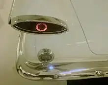 The Valiant was less radical in configuration than General Motors' compact Chevrolet Corvair, which had an air-cooled rear-mounted engine, but was considered more aesthetically daring than the also-new Falcon and Studebaker Lark compacts, which had more conventional looks; the Valiant boasted a radical design that continued Exner's "Forward Look" styling with "sleek, crisp lines which flow forward in a dart or wedge shape".[7] The flush-sided appearance was a carried-over feature from Chrysler's Ghia-built D'Elegance and Adventure concept cars which also gave the Valiant additional inches of interior room.[7] The Valiant's styling was new, yet with specific design elements that tied it to other contemporary Chrysler products, such as the canted tailfins tipped with cat's-eye shaped tail lamps and the simulated Continental spare tire pressed into the trunk lid that were thematically similar to those on the Imperial and the 300F. According to Exner, the stamped wheel design was used not only to establish identity with other Chryslers, but to "dress up the rear deck area without detracting from the look of directed forward motion".[7]