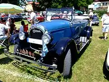 The Plymouth automobile was introduced at Madison Square Garden on July 7, 1928.[1] It was Chrysler Corporation's first entry in the low-priced field previously dominated by Chevrolet and Ford.[2] Plymouths were initially priced higher than the competition, but offered standard features such as internal expanding hydraulic brakes that Ford and Chevrolet did not provide.[3] Plymouths were originally sold exclusively through Chrysler dealerships,[3] offering a low-cost alternative to the upscale Chrysler-brand cars, listing the 4-door 5-passenger Touring Sedan at US$695.[4] The logo featured a prow view of the ship Mayflower which landed at Plymouth Rock in Plymouth, Massachusetts. However, the inspiration for the Plymouth brand name came from Plymouth binder twine, produced by the Plymouth Cordage Company, also of Plymouth. The name was chosen by Joe Frazer due to the popularity of the twine among farmers.[5]