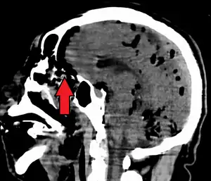CT scans of patients with a tension pneumocephalus typically show air that compresses the frontal lobes of the brain, which results in a tented appearance of the brain in the skull known as the Mount Fuji sign.[1][2][3] The name is derived from the resemblance of the brain to Mount Fuji in Japan, a volcano known for its symmetrical cone. In typical cases, there is a symmetrical depression near the midline (such as the crater of a volcano), due to intact bridging veins.[3] Its occurrence seems to be limited to tension pneumocephalus (not occurring in pneumocephalus without tension).[4] The sign was first described by a team of Japanese neurosurgeons.[5]