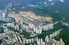 To the east of the road is Tai Sheung Tok hill. From 1964,[2] the hilltop was developed as a large quarry, Anderson Road Quarry (安達臣道石礦場), highly visible from much of Kowloon and Hong Kong, which supplied construction aggregate to Hong Kong until July 2017, operated by the K.Wah Group,[3][4] when it was one of only three quarries still operating in Hong Kong, along with those in Shek O and Lam Tei. The quarry site is on the ridge surrounding Kowloon, visible from much of urban Hong Kong, but was ultimately deemed to damage the beauty and the fungshui of Victoria Harbour.