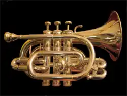 The pocket trumpet is a B♭ or C trumpet that is constructed with the tubing wound into a much smaller coil than a standard trumpet, generally with a smaller diameter bell. It is not a standard instrument in a concert band or orchestra and is generally regarded as a novelty. It has been used by soloists in jazz (Don Cherry played the similar pocket cornet) or other ensembles to add flair and variety.[1]