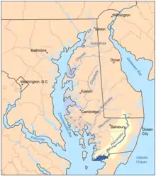 ![]() Map of the rivers of the Eastern Shore of Maryland with the Pocomoke and its watershed highlighted. | |