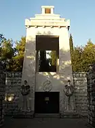 After the Yugoslav coup d'état on 27 March 1941, demonstrations supporting the coup took place in Podgorica.[12] As a result of the coup, Yugoslavia turned against its previous alliance with the Axis powers and was subsequently invaded. Podgorica was bombed over 80 times throughout the course of the war.[13] The city was first bombed by the Luftwaffe on 6 April 1941. On 5 May 1944, Podgorica was bombed by the USAAF in an attack against Axis forces, although the bombardment that day killed approximately 400 civilians.[14] The city was liberated on 19 December 1944. According to the Museum of Genocide Victims, a total of 1,691 people were killed in Podgorica over the course of the war.[15]
