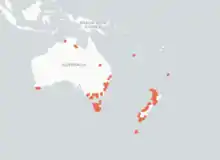 | Podomitrium phyllanthus has a sparse distribution in Australia, New Zealand and New Caledonia.[1] | |