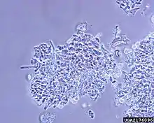 A wide variety of rose species are susceptible to powdery mildew. In light of this it is more practical to discuss the rose varieties that are resistant as opposed to those that are susceptible. Two varieties that have been found to show resistance to rose powdery mildew are "Paul's Pink" rose variety and the "Magic" rose variety.[3] Other research has shown that many chestnut rose (Rosa roxburghii) varieties are also resistant to powdery mildew. Rosa sterilis, Rosa kweichowensis, Rosa laevigata, Rosa lucidissima, and Rosa chinensis have all been shown to be resistant to powdery mildew. R. multiflora var. multiflora and R. multiflora var. cathayensis have all been shown to be susceptible to rose powdery mildew.[4] Symptoms caused by the rose powdery mildew can be a dwarfing of the growth of the plant, or the twisting and deforming of leaves,[5] but more noticeable is a sign of the disease, which is the white condia, the “powder” that appears on the plant surfaces, such as leaves, shoots, flowers, and buds.[1] The fungus may grow on both new and old leaves, but is generally more concentrated on the underside of the leaf [6]