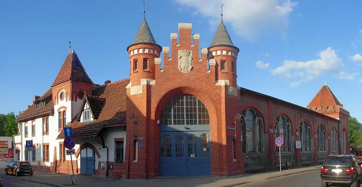 In 1899, an intensive work has been carried out to clean the site of the former castle hill, lying on the east side of Podwale street, demolishing the evangelical church. A few years later, in 1904, the Municipal Market Hall (German: Städtische Markthalle) has been erected and extended eastward, on Magdzińskiego street.[1] The building has been designed by the company "Boswau & Knauer GmbH" from Berlin.[10] It has been built at a time when civil society started to take matters related to health and hygiene into consideration: hence the roofed hall to maintain hygiene standards in the food trade. The city of Bromberg was the main investor of the project. In addition to the plot of the Evangelical church, part of neighbouring property of rentier Albert Wiese was used. The construction started in autumn 1904 and ended in the spring 1906: the official opening took place on Friday 20 July 1906, in the presence of municipal authorities.[10] Part of the Market Hall giving onto Podwale street housed accommodations, such as the apartment of the inspector of the Hall, veterinarian offices or a police station. Under the main hall was room for 96 stands, the vast majority of them being meat stands. Each stand (meat and fish) had been provided with a separate number and company name. The building includes a 3.5 m high cellars. A ring of bell proclaimed the end and beginning of trade.[10] While inside the Hall only meat (including fish and sea products) was sold, other goods could be bought at the weekly fairs held in the open squares.[10] Today the complex is open to all kind of trade, under the ownership of Bydgoszcz's grocers (Polish: "Bydgoska Spółdzielnia Spożywców w Bydgoszczy"). In 2009, a full renovation of the building has been carried out.