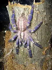 Poecilotheria metallica, also known as the peacock tarantula,[1] is an Old World species of tarantula. It is the only blue species of the genus Poecilotheria. Like others in its genus it exhibits an intricate fractal-like pattern on the abdomen. The species' natural habitat is deciduous forest in Andhra Pradesh, in central southern India. It has been classified as Critically endangered by the IUCN.