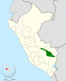 It is endemic to Peru. Its natural habitat is subtropical or tropical moist lowland forests.
