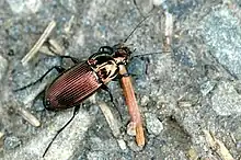 Poecilus cupreus is a species of ground beetle native to the Palearctic (including Europe). In Europe, it is found in almost every country, and is only absent in a number of small states and islands: Andorra, the Azores, the Canary Islands, the Channel Islands, the Cyclades Islands, Cyprus, the Dodecanese Islands, the Faroe Islands, Franz Josef Land, Gibraltar, Iceland, Madeira, Malta, Monaco, the North Aegean Islands, Novaya Zemlya, San Marino, Selvagens Islands, Svalbard and Jan Mayen, and Vatican City.