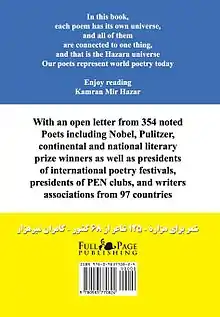 Poems for the Hazara (ISBN 978-0983770824)(ISBN 978-0983770862) is a multilingual poetry anthology and a collaborative poem composed of the works of one hundred twenty five internationally recognized poets from sixty-eight countries. Poems in this book are in English, Spanish, Catalan, Japanese, Norwegian, Turkish, Hazaragi, Italian, Greek, German, Irish, Hebrew, Romanian, French, Armenian, Hungarian and Portuguese.[1][2][3][4][5] All non-English poems have been translated into English. "Poems for the Hazara" includes the poetry anthology and a collaborative poem (Collaborative poetry) featuring contributions from 23 international poets. An open letter from 354 celebrated poets including Nobel, Pulitzer, continental and national literary prize winners as well as presidents of PEN clubs, and writers associations from 97 countries is included at the end.[6] This letter is addressed to world leaders in support of the Hazara people. The executive editor is Hazara poet, journalist and human rights activist, Kamran Mir Hazar.[7][8]