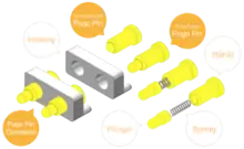 A pogo pin or spring-loaded pin is a type of electrical connector mechanism that is used in many modern electronic applications and in the electronics testing industry.[1] They are used for their improved durability over other electrical contacts, and the resilience of their electrical connection to mechanical shock and vibration.[2]