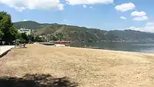 Pogradec (Albanian pronunciation: [pɔɡɾaˈdɛt͡s]) is the eleventh most populous city in Albania and the capital of the eponymous municipality. It is located on a narrow plain between two mountain chains along the southwestern banks of the Lake of Ohrid. Its climate is profoundly influenced by a seasonal Mediterranean and Continental climate. The total population is 61,530, of which 20,848 in the municipal unit (the pre-2015 municipality) Pogradec (2011 census).[2]