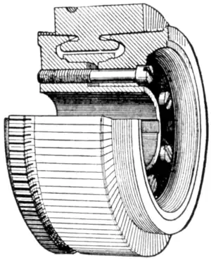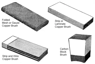 Various developments took place to automate the process of adjusting the commutation and minimizing the sparking at the brushes. One of these was the development of 'high resistance brushes', or brushes made from a mixture of copper powder and carbon.[3] Although described as high resistance brushes, the resistance of such a brush was of the order of milliohms, the exact value dependent on the size and function of the machine. Also, the high resistance brush was not constructed like a brush but in the form of a carbon block with a curved face to match the shape of the commutator.