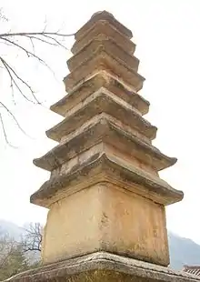 The main hall of the temple, Taeung Hall (大雄殿) was also destroyed during the Korean War by U.S. bombing; reconstructed in 1976, it stands as faithful replica of the 1765 original. In the courtyard between it and Manse Pavilion stands the 13-storey Sokka Pagoda (釋迦塔), erected in the 14th century and designated National Treasure #144.