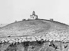 It was here at Point Conception in 1856, that the lighthouse was built high on the sandstone cliffs, above the location of the present lighthouse. The first order Fresnel lens[7] and steel tower for the lighthouse were made in France at a cost of $65,068 and was transported around Cape Horn. A report indicates that the lighthouse was severely damaged during the Fort Tejon earthquake of January 9, 1857.